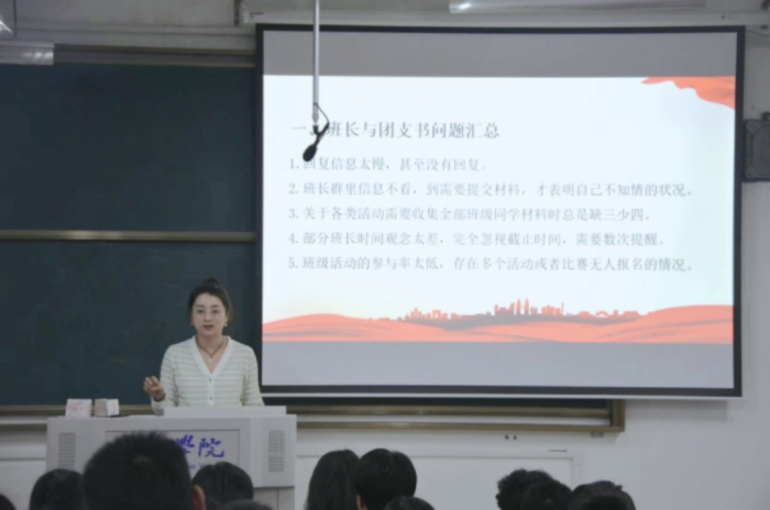 方婷婷在讲话中总结梳理了近期各班级在工作中存在的问题,强调班长作为班级的核心管理者,应增强责任意识,及时传达信息并督促同学保质保量完成各项任务;班级员工干部要形成合力,以提升班级整体工作效率。