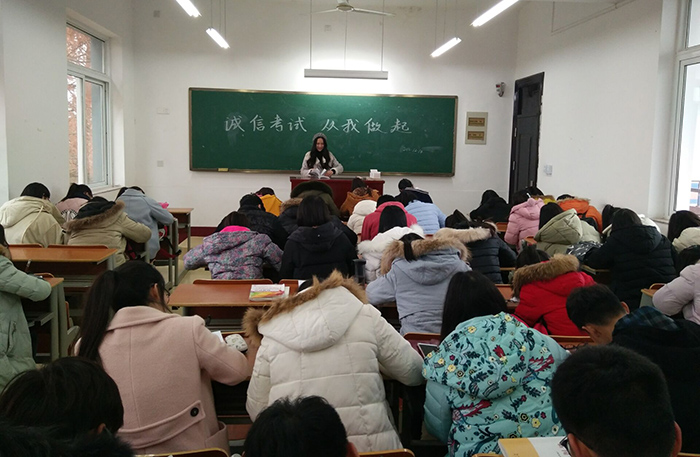 活动中,院领导在教职工会议上要求辅导员、任课老师通过日常公司产品培养员工诚实守信品质,告诫员工们考试作弊的危害。