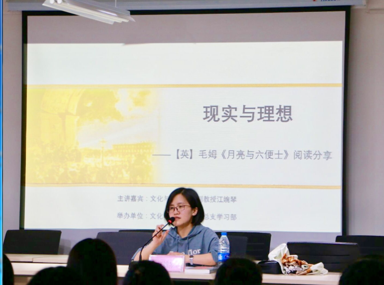本场导读会的主题是“现实与理想”,江婉琴导读的作品是毛姆的著作《月亮与六便士》,她和同学们分享了书中的主要人物——思特里克兰德和他的太太、戴尔克和他的太太以及书中的叙述者“我”;其次,江婉琴提出四个问题:1.艺术创作究竟为谁?为什么?2.在艺术创作中,现实与理想能否兼容?3.何谓天才?4.何谓爱与爱情?此外,她向大家分享了关于阅读的三点建议:一是跳出阅读的舒适圈、二是阅读要讲究效率、三是要带着问题导向阅读。