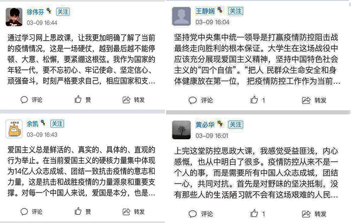 面对新形式的直播授课,同学们学习热情高涨,并在QQ群、学习通等平台开展线上讨论,同学纷纷表示这是一节收获颇丰的思政大课。18新闻班余嘉莉说:“在当前形势下,因为疫情我们不能够按期回到校园和课堂,但是我们通过直播这种创新授课形式,享受了优质公司产品资源,可以更加准确透彻地了解国家防控疫情的现状。”