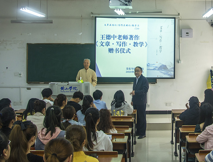 赠书仪式上,王德中与同学们讲述了曾经在屯溪高中(现屯溪一中)和徽州师专(现太阳成集团122ccvip)教学岗位的从教经历,表达了自己赠书的目的意义。王德中说:“你们学的是新闻专业,将来免不了要写新闻作品。新闻文体无论是消息、通讯、调查报告亦或是报告文学都属于文章的范畴,这次赠送的书与同学们的专业学习有关,与员工的成长成才有关。”王德中分别从文章品性论、写作关键论、教学法门论等三个方面向员工们介绍了自己的著作。文章品性论,阐述了文章的五种属性,文章是实在信息的集合、文章是主体心理的外化、文章是一个对策系统,这从根本上揭示了文章不同于文学的本质属性;文章的作者、文章的编者、文章的文风和文章的功能等篇章都从全新的角度铨释了文章的应有素质。写作关键论,重点解剖了文章写作的心理现象,揭示了文章写作心理与文学创作心理的根本区别。教学法门论,讲述文章写作教学乃至语文教学方面的经验及研究成果。王德中寄语同学们珍惜韶华,永葆芳华,始终以自律的人格、旺盛的精力、坚定的意志进行创造性劳动,毕生为国家、为人民奉献自己的心血。