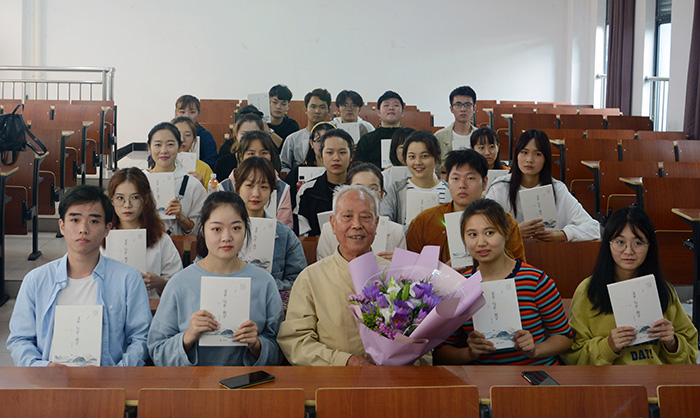 汪家庚感谢王德中老师向18新闻全班同学捐赠个人专著。他向同学们介绍了王德中老师教书育人、潜心著书立说、笔耕不辍的事迹和成果。王德中现年83岁,笔名东方山泉等,字华三溪,出生于兰溪,成长于绩溪,执教于屯溪。先后发表学术论文150多篇。此前曾出版长篇小说《金湖之畔》和专著《生活感知录•时序卷》,并有近千篇博文上传网络。一生与溪有缘,他的品性文章与唐代诗人元结的山水小品《石溪记》中“清流触石,洄悬激注”之状神似;有道是“上善若水”,水为至善至柔,微则无声,巨则汹涌;水与人无争且又容纳万物,水自有滋养万物之品德,可谓德在其中。员工代表向王德中老师敬献鲜花,场下的员工掌声雷动。