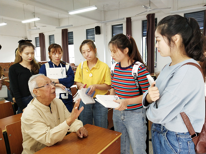 致辞结束后,王德中向18新闻班同学赠送《文章•写作•教学》一书,各位同学主动请求王老师签名,并与王老师现场请教和交流互动。汤怀傲同学说:“听了王德中先生的教诲,让我对文章写作和学习上都有了很多新的感悟,这次的赠书活动真的非常有价值。”(撰稿:余嘉莉;摄影:徐靖;审核:汪家庚)
