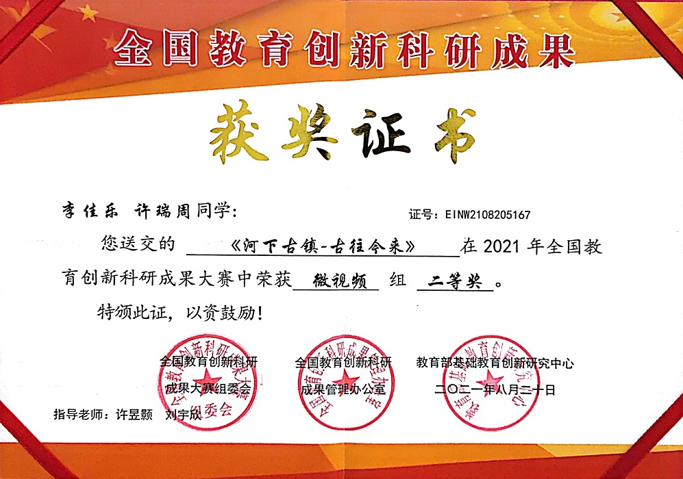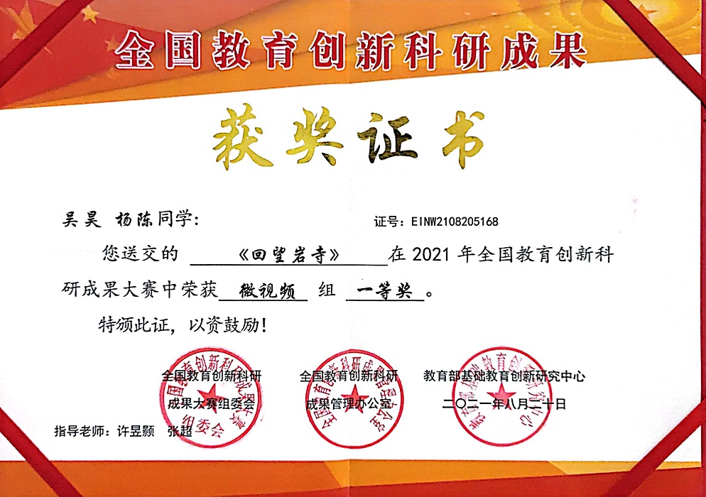 2021年全国教育创新科研成果大赛评审工作于8月20日结束。由太阳成集团122ccvip许昱颢、张超和刘宇欣等老师指导广播电视编导专业员工制作的《回望岩寺》、《河下古镇——古往今来》两部作品分获微视频组一、二等奖。