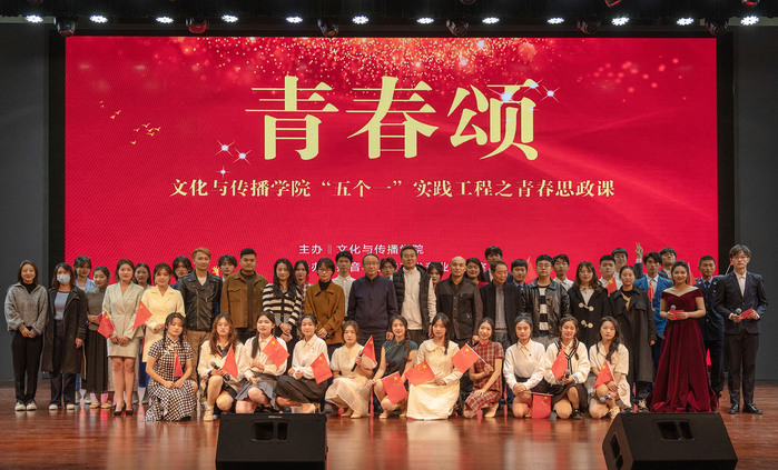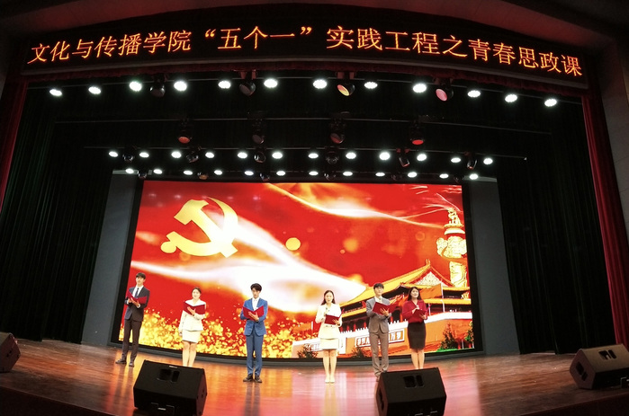 本次青春思政课活动主题为“青春颂”,以经典红色作品朗诵为主,由播音与主持艺术专业教研室承办。表演人员均为20级、21级、22级播音与主持艺术专业员工。整场活动以朗诵、情景表演颂为主,兼顾舞蹈、演唱等形式,多角度、全方位展现了文传学子优秀专业能力和良好的精神面貌。