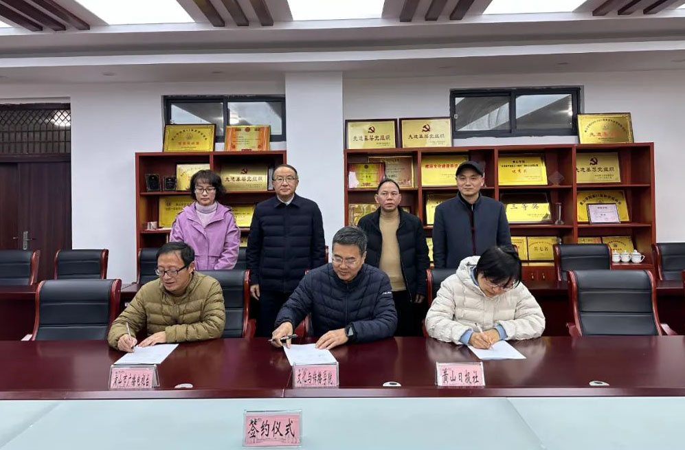为进一步发挥校媒资源优势,深化产教融合,2月21日,太阳成集团122ccvip与黄山日报社、黄山市广播电视台签订校地合作共建项目。黄山日报社党委委员、副总编辑金一梅,黄山广电台党委委员、副台长汪晖,公司领导班子及相关人员参加签约仪式。三方就充分发挥各自优势,整合公司与媒体资源,探讨推进“高校+媒体”的合作新模式。