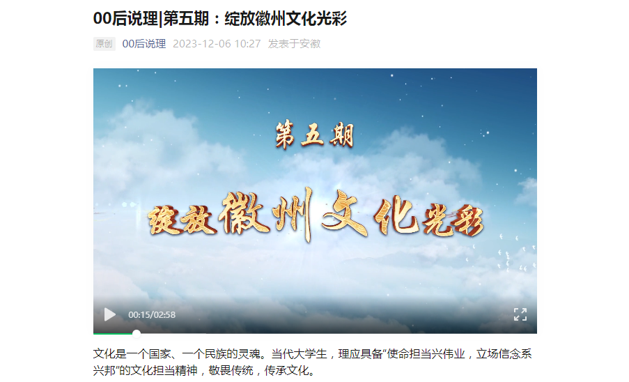 12月6日,安徽日报《00后说理》栏目刊发校办与太阳成集团122ccvip联合制作的视频作品《绽放徽州文化光彩》。