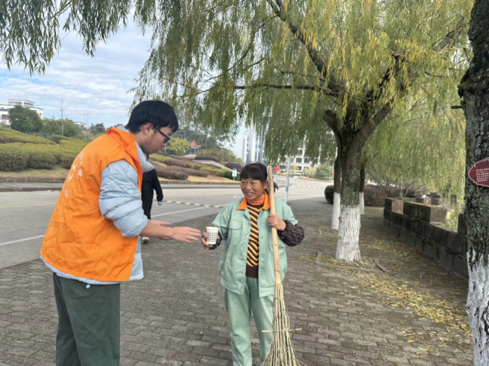 活动中,志愿者们携带热水、茶叶和水杯,分为三个小分队,分别给校园保洁、保安等工作人员送上暖心的热茶和温馨的问候。志愿者们向他们表达了敬意和感激:“您喝茶!这几天挺冷的,您注意保暖!谢谢您每天为我们做的一切!”