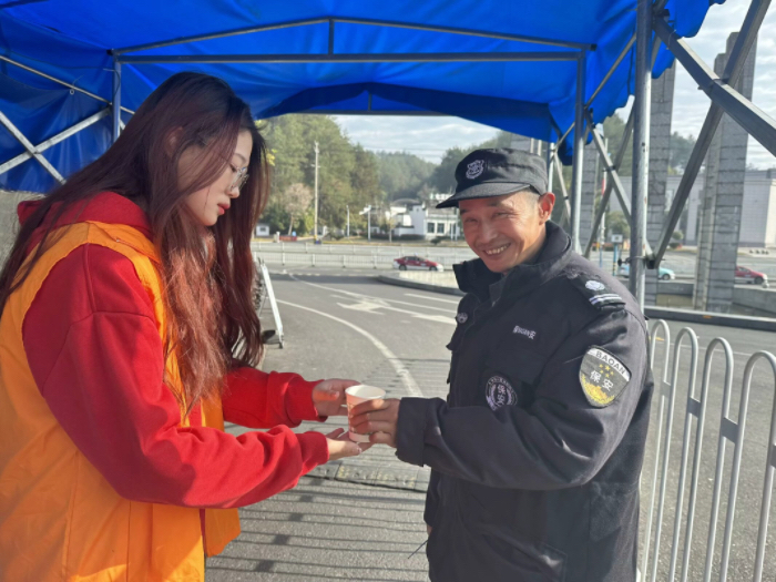 后勤工作人员捧过热茶,对志愿者表达了谢意,并叮嘱员工们也要及时增添衣物。