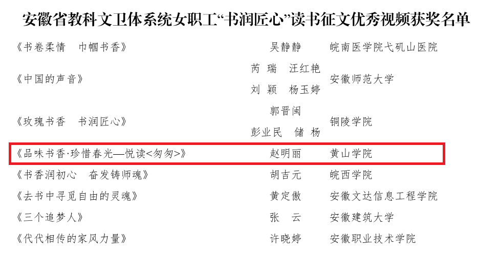 近日,安徽省教科文卫体工会发文,通报在省教科文卫体系统女职工“书润匠心”读书征文活动中活动评选结果。公司播音与主持专业赵明丽老师作品《品味书香·珍惜春光——悦读<匆匆>》获优秀视频奖。