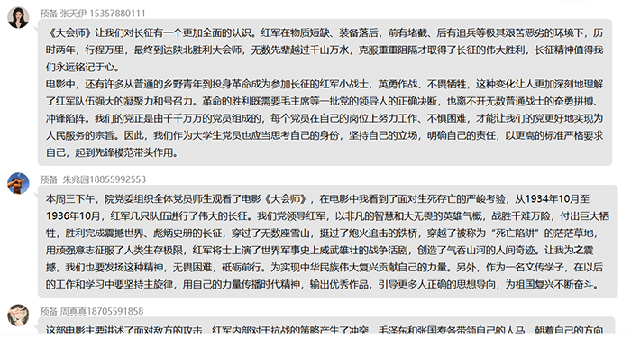 该片在广大师生中产生强烈反响。教工党员李妍说,我们要继续学习长征精神,学习先辈革命理想高于天、不怕牺牲、排除万难去争取胜利的坚定信念和顽强斗志。员工党员凡占杰说,实践证明,党领导人民军队坚定信仰,从无到有、从小到大、由弱到强、从一个胜利走向另一个胜利,而今天我辈要继续发扬我们党的优良传统和作风,在中华民族伟大复兴中贡献自己的青春力量。(撰稿:程会会;摄影:汪海波;审稿:汪家庚)