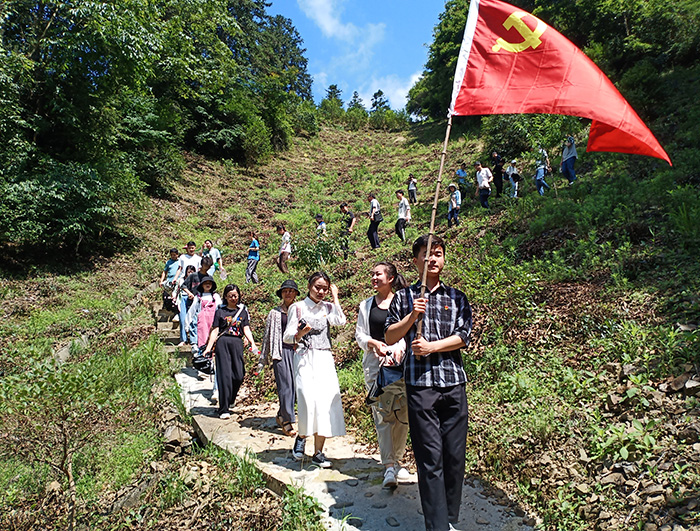 碣石村属于富溪乡的革命老区,有着丰富的红色资源。在参观考察环节,全体成员“重走红军路”,接受红色革命精神洗礼。烈日当头,但大家仍然热情高涨,在规定时间内走完了全程。之后参观了依托小坞首届歙县民主政府筹备地旧址建成的“红色富溪记忆馆”,聆听了红色故事,大家感慨于在这片土地上传承下来的革命先烈精神和军民鱼水情。同时,师生党员面对鲜红的党旗,重温了入党誓词。