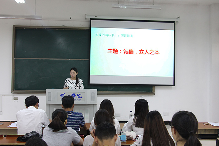 本次活动的第一个环节为诚信主题演讲比赛。比赛过程中,选手们有的与观众互动频繁,有的沉熟稳重,有的激情昂扬,充分展现了各自口语表达能力和各具特色的个人魅力。经过角逐,来自2014级新闻班的龙雪琴同学所作的题为《一个新闻记者的诚信》的演讲,表现出色,获得了一等奖。
