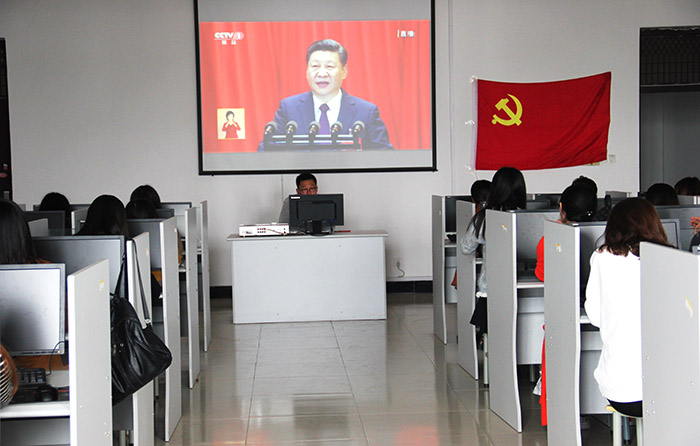坚持立德树人,加强对老员工党员和入党积极分子的教育和培养,2017年10月18日上午,公司党总支组织干部教师、在校员工党员在逸夫图书馆二楼报告厅收听收看了党的十九大开幕会实况,组织老师、员工代表和入党积极分子在本院实训中心机房观看大会实况。大家精神振奋,反响热烈。