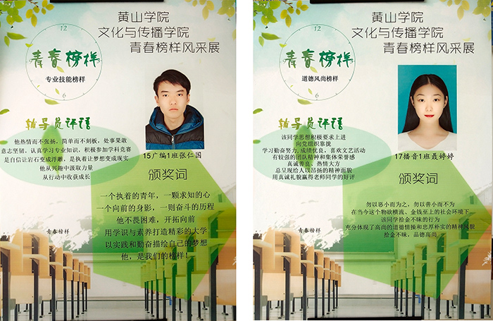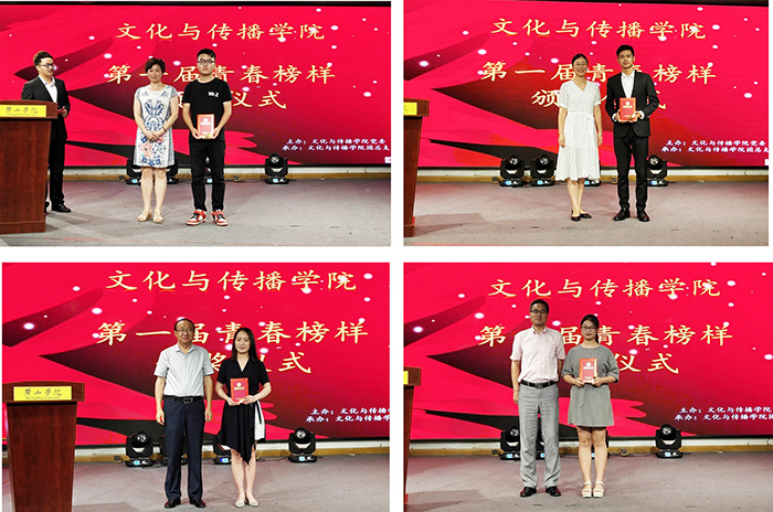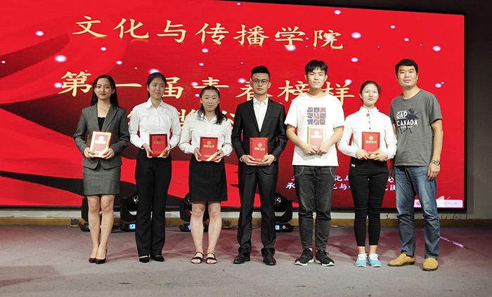 经个人报名、班级推选、公司评审,15广编班张仁国、15播音班韩帅获“专业技能榜样”称号;14广编班窦永梅、16播音班赵阳获“文体活动榜样”称号;15播音班唐梦婷、16戏文班刘明明获“员工工作榜样”称号;16广编2班邵静获“爱心志愿榜样”称号;17播音1班聂婷婷获得“道德风尚榜样”称号。17播音1班吴纯、刘永群,17播音2班陈祥,17新闻班曹惠、余真真、朱馨月等6位同学获得青春榜样提名奖。