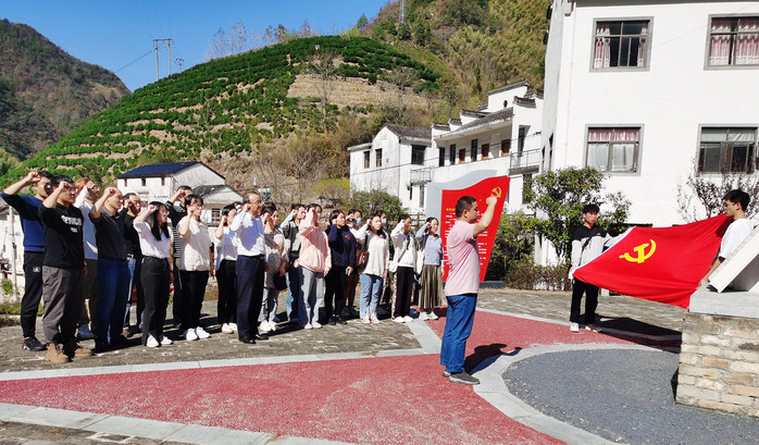 在岩源村红色文化广场,师生党员面向党旗庄严宣誓,重温入党誓词。