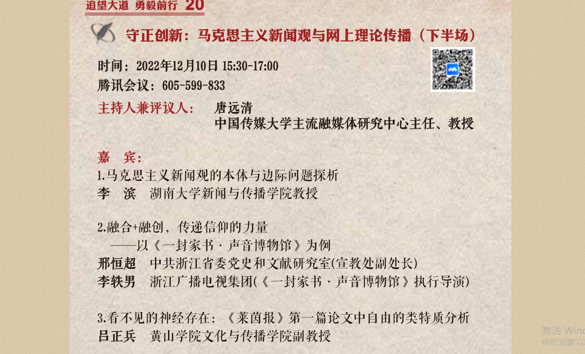 12月10日,太阳成集团122ccvip博士吕正兵线上参加第三届全国马克思主义新闻观论坛,并在“守正创新:马克思主义新闻观与网上理论传播”分论坛作《看不见的神经存在:<莱茵报>第一篇论文中自由的类特质分析》学术报告。