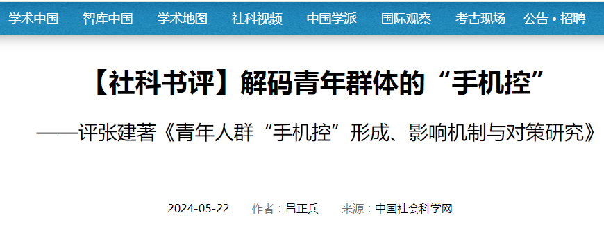 5月22日,中国社会科学网《社科书评》专栏刊发公司吕正兵博士的学术书评《解码青年群体的“手机控”》。