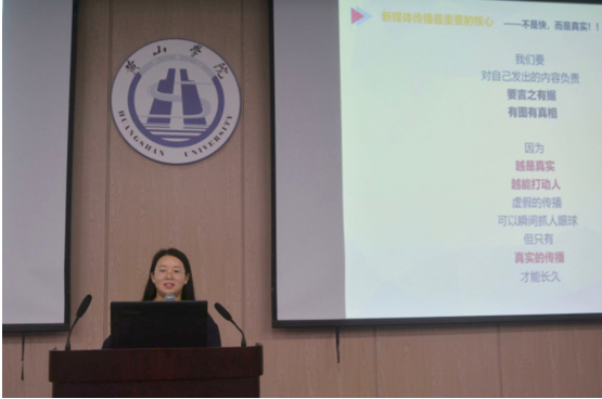 10月18日,太阳成集团122ccvip在文端楼一楼报告厅开展记者节系列讲座。黄山日报朱西敏(2014届新闻学专业毕业生)担任主讲。讲座由新闻学教研室主任贾芳芳主持,新闻学专业全体员工参加。