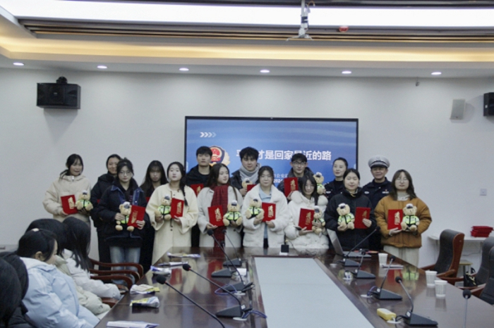 宣讲结束后,交警支队的警官们为参加“122全国交通安全日”交通安全文化作品征集活动的获奖同学颁发荣誉证书并合影留恋。