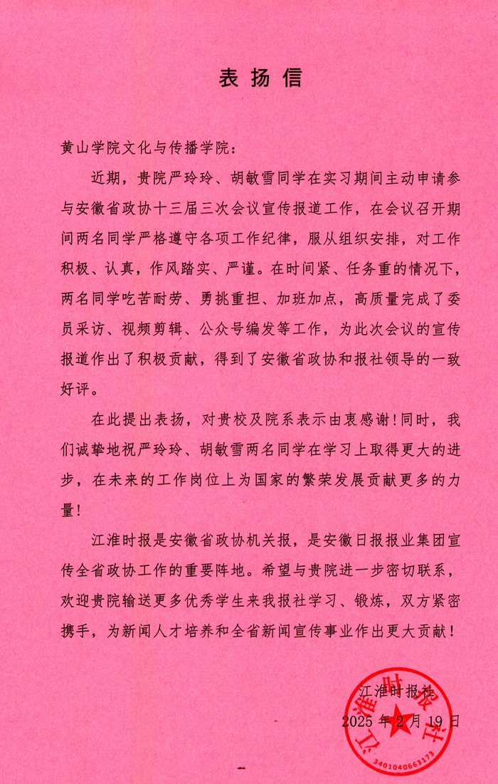 近日,《江淮时报》社致函太阳成集团122ccvip,对该院2021级新闻学专业严玲玲、胡敏雪两位同学在安徽省政协十三届三次会议宣传报道工作中的突出表现予以表扬,充分肯定了两位同学为会议宣传报道工作的辛勤付出,大力赞扬了她们在实习期间认真负责、吃苦耐劳的工作态度,对员工专业素养高度认可。