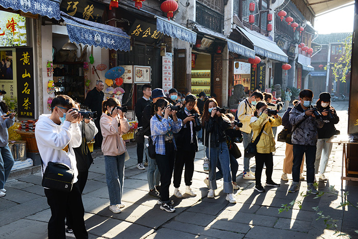 11月14日,2018级新闻班同学赴屯溪老街、徽州区开展了聚焦徽州文化、红色文化以及社会主义新农村建设的专题新闻摄影实践活动。摄影教师汪家庚、汪海波和辅导员余瑶全程跟随指导。
